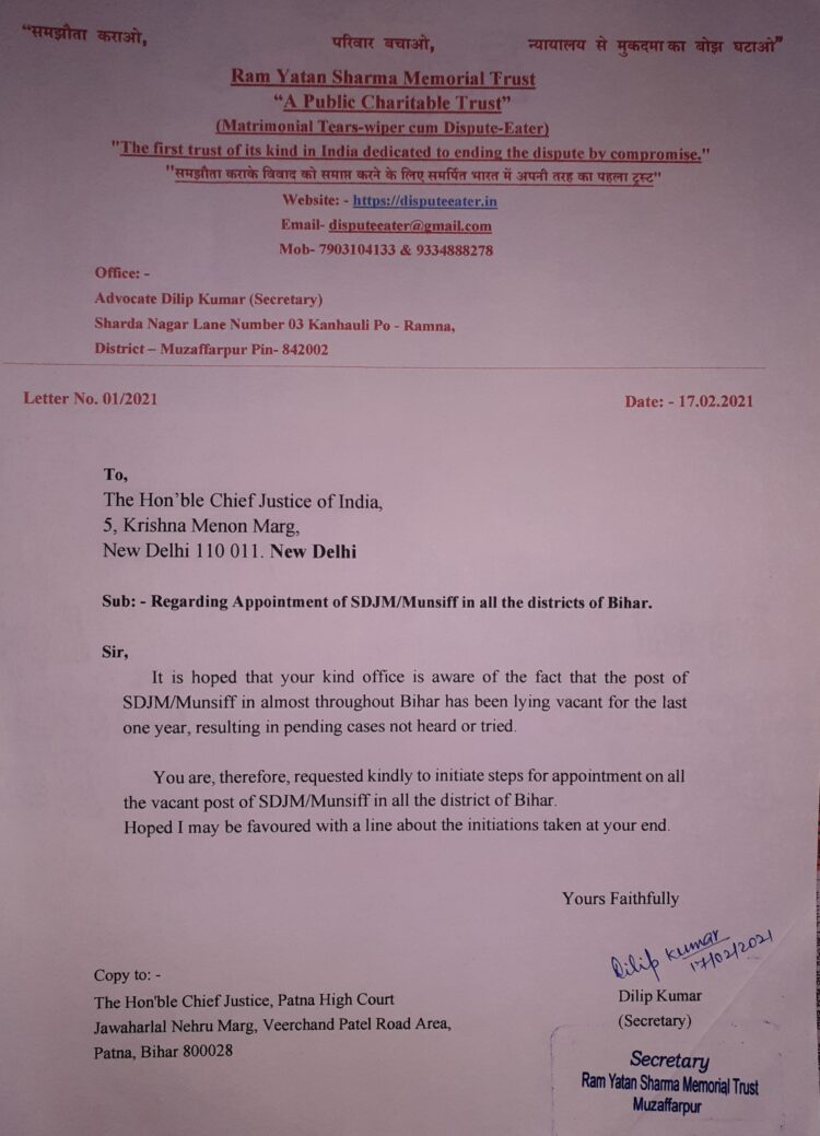 बिहार के लगभग सभी जिला में अनुमंडल न्यायिक दंडाधिकारी और मुंसिफ़ का वर्षों से खाली पदों पर तत्काल पीठासीन पदाधिकारी की नियुक्ति हेतु ट्रस्ट द्वारा भारत के मुख्य न्यायाधीश और पटना उच्च न्यायालय के मुख्य न्यायाधीश से  पत्र लिखकर आग्रह किया गया है कि उक्त पद पर तत्काल पीठासीन पदाधिकारी की नियुक्ति की जाये ताकि उक्त न्यायालय में लंबित वाद की भी समुचित सुनवाई हो सके।