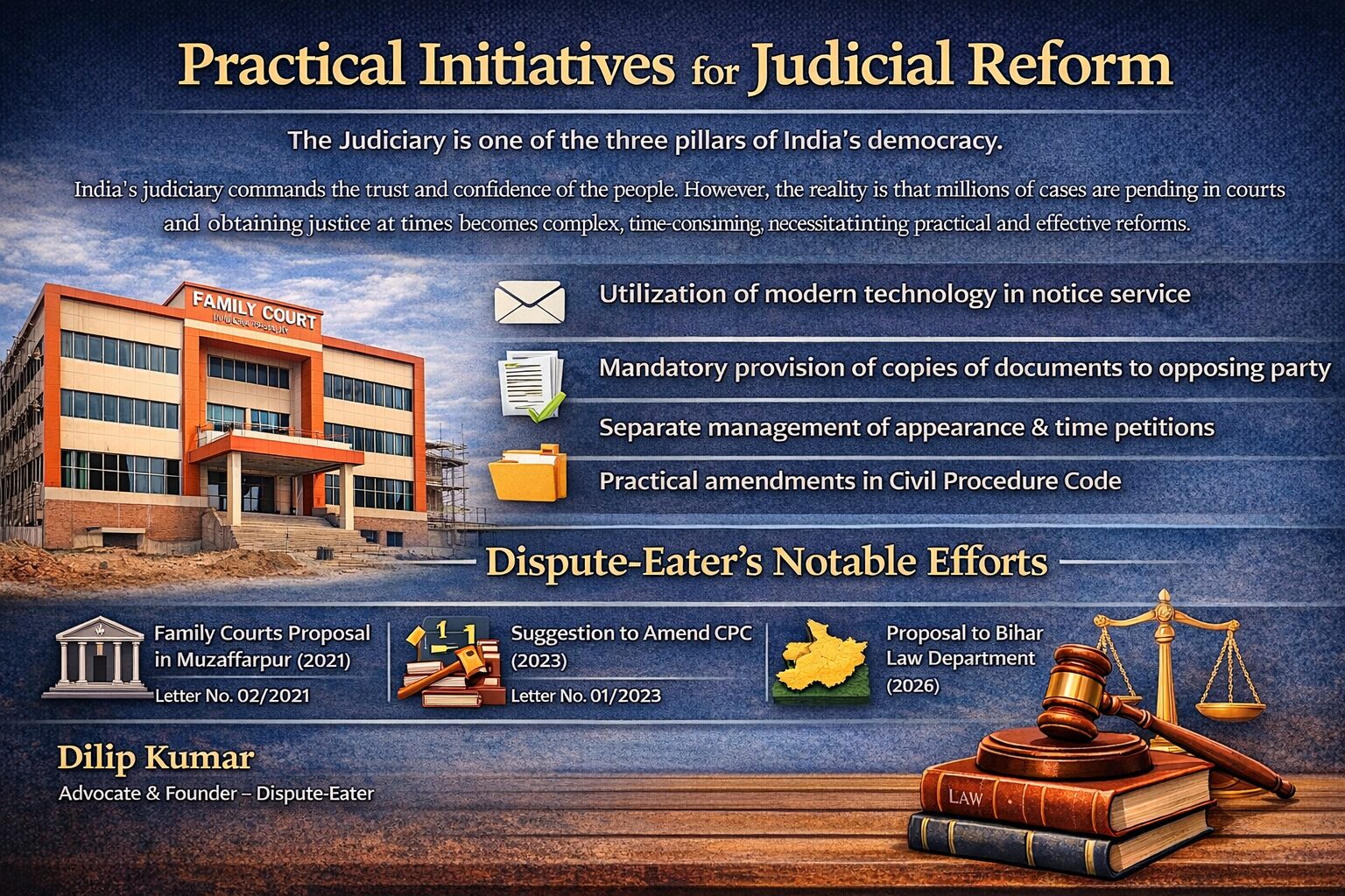दिनांक 27.02.2026  को डिस्प्यूट-ईटर द्वारा बिहार सरकार के विधि विभाग को पत्र लिखकर सिविल प्रक्रिया संहिता में आवश्यक संशोधन एवं न्यायालयीन प्रक्रिया में व्यावहारिक सुधार हेतु पुनः अनुरोध किया गया।